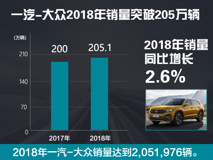 2018年一汽-大众累计销量突破205万辆,达到2,051,976辆。大众品牌累计销量达到1,391,088辆,奥迪品牌累计销售新车660,888辆(含进口车),同比增长11%。其中大众迈腾、速腾、捷达等5款车型以及奥迪A4L、A6L全年销量均超过12万辆。