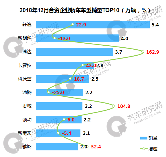 12月合资轿车销量中,东风日产轩逸连续蝉联畅销车型,单月销售5.4万辆,排名第一,同比增长22.9%;上汽大众朗逸销量紧随其后,共计销售4.0万辆,同比下滑13.0%。前十车型中,捷达和思域增长较快。