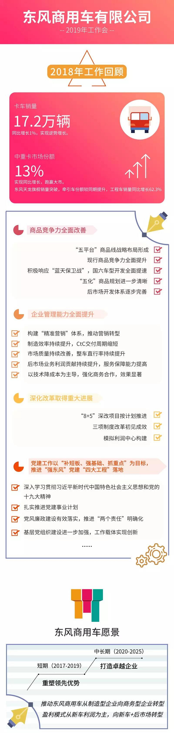 1月16日,东风商用车有限公司2018年度总结表彰会暨2019年工作会召开。本次工作会透露出哪些重点内容?一张图告诉你!