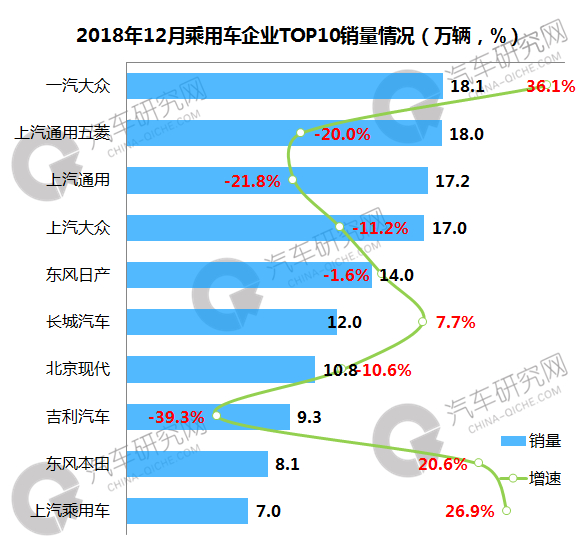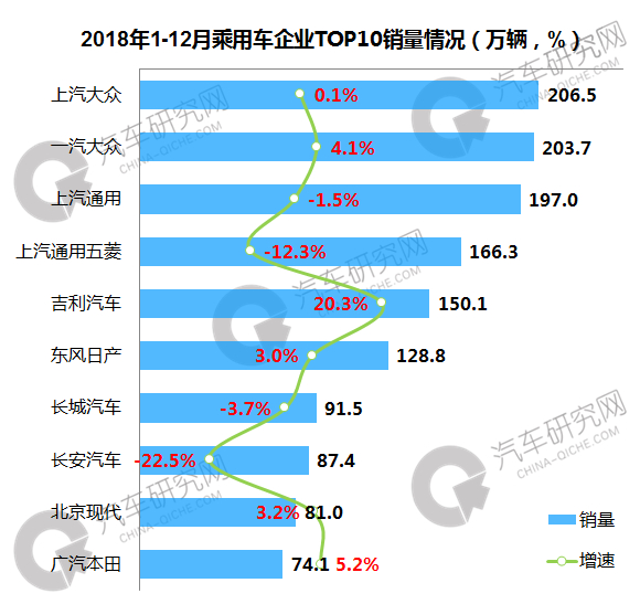 2018年乘用车企业中,南北大众累计销量均突破200万辆大关,上汽通用以197万辆成绩挤进三甲之列;前十企业中,吉利最后虽然未能达成目标销量,但仍突破150万辆,增速位居第一位。