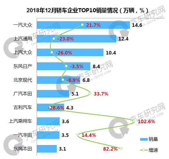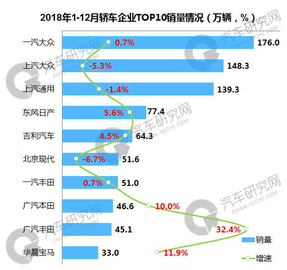 2018年一汽大众轿车销量蝉联第一 广汽丰田增幅超30%
