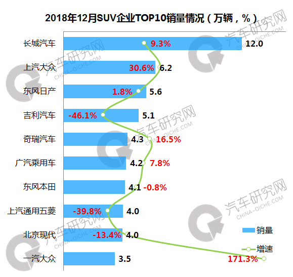12月SUV前十企业中,长城汽车销量连续两月突破10万辆;一汽大众表现突出,单月增幅超过150%;吉利和上汽通用五菱销量均出现大幅下滑。