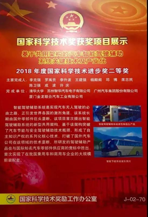 2019年1月8日上午,2018年度国家科学技术奖励大会在北京隆重举行,习近平、李克强等党和国家领导人出席大会,为获奖代表颁奖。金龙客车与清华大学等单位联合研究的“基于结构共用的汽车智能驾驶辅助系统关键技术及产业化”项目,喜获国家科学技术进步奖二等奖。金龙客车因此成为福建省唯一获此殊荣的整车企业。