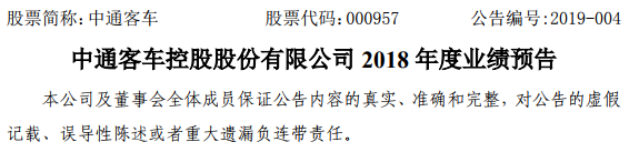 1月28日,中通客车控股股份有限公司(下称“公司”)发布2018 年度业绩预告,公司预计2018年归属上市公司股东的净利润为2500万-3750万元,同比下滑86.93%-80.39%,每股收益为0.04-0.06元,而上年为0.32元。