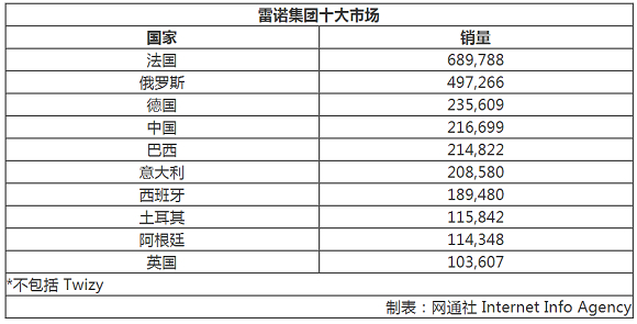 在全球市场表现方面,雷诺-日产-三菱联盟在中国销量最高,销售新车1,920,541辆。雷诺集团的最大单一市场为法国,累计出售新车689,788辆;日产汽车的最大单一市场为中国,累计销量为1,563,986辆;三菱汽车的最大单一市场为印尼,累计出售新车146,805辆。