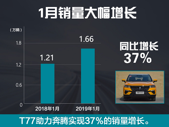 自去年发布新品牌以来,奔腾一直给人一种年轻、有活力的形象,旗下产品也越来越符合当下消费者的“口味”,市场表现持续攀升。从奔腾官方了解到,2019年1月份,奔腾超额完成销量任务,终端实销同比增长37%,其中爆款车型T77在上市两个月之际,交付新车突破1万辆,1月成功实现销量近8000辆。