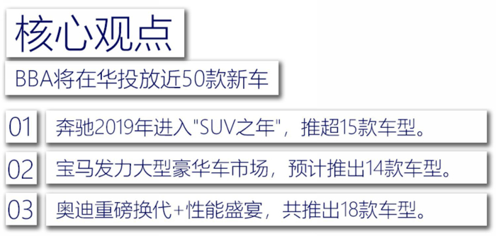 纵观BBA在2019年的新车规划,我们不难发现,巩固现有优势细分市场、开拓全新的细分市场以及完善产品线对他们来说同样重要。奔驰将在2019年发力SUV市场,进一步提升该细分市场的竞争力;而宝马则将更多的精力放在旗舰车型上,进一步提升其豪华品牌的调性;奥迪则相对全面,在保证现有车型的改款换代同时,也将进一步发展和提升高性能品牌。虽然三大豪华品牌在新品规划方面各有特色,不过其最终目标都是获得更好的销量。随着豪华车市场的整体利好,2019年豪华品牌的乱战也将更加激烈。