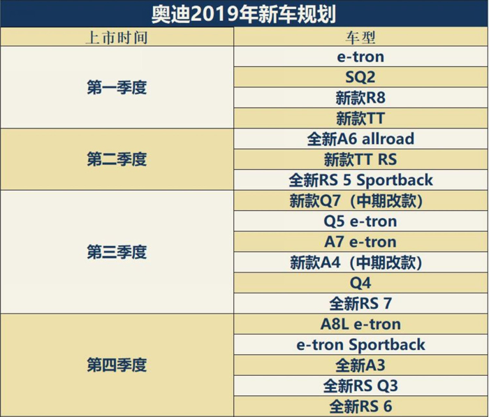 奥迪在2019年提出了68.2万辆的销量目标,同比预增长3.2%;而在产品方面,奥迪除了刚刚上市的全新奥迪A6L之外,还将推出全新奥迪A3、新款奥迪A4,针对性能车市场的SQ2、全新RS