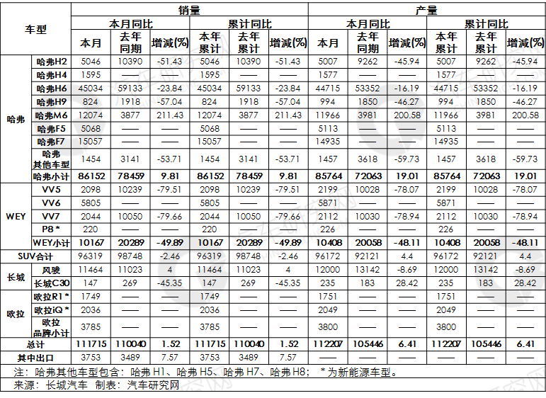 2月14日,长城汽车发布了2019年1月产销快报,根据数据显示,1月,长城汽车共销售新车111715辆,同比增长1.52%。其中,出口3753辆,同比增长7.57%。哈弗、WEY和长城皮卡分别以86152辆、10167辆和11611辆的不俗的成绩,WEY品牌同比下滑明显,达到49.89%;长城皮卡同比增长2.83%。