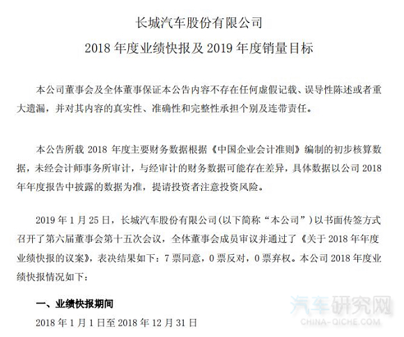 1月25日晚间,长城汽车发布2018年度业绩快报及2019年度销量目标,根据业绩快报数据,2018年营业总收入约为人民币994.69亿元,较上年同比减少1.68%;净利润约为人民币53.95亿元,同比增加6.97%;归属于上市公司股东的净利润约为人民币53.54亿元,同比增加6.51%。