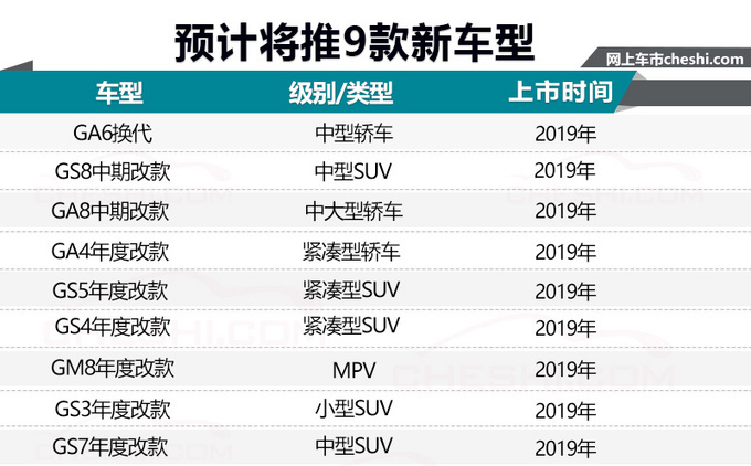 跨入2019年,广汽传祺已经推出了全新MPV——GM6,接下来还将对旗下全系车型进行更新换代,深度挖掘现有产品的销售潜力,车型数量预计在9款左右。根据已公布的消息,新产品中将包括GA6换代以及GS8中期改款等车型,其中GS8中期改款将换搭全新2.0T发动机。如此大规模的投放,更加令人对其2019年的表现充满期待。