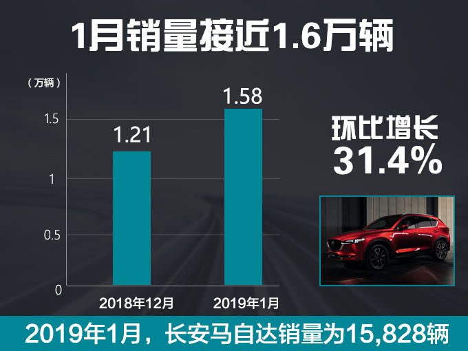 2018年,面对低迷的国内汽车市场,长安马自达从未动摇过 “特色精品”战略,全年取得了163,352辆的销量表现。从马自达中国官方获悉,长安马自达1月销量达到15,828辆,环比去年12月大幅增长31.4%。其中,长安马自达主力车型昂克赛拉的销量超过了1万辆,环比增幅超过24%。