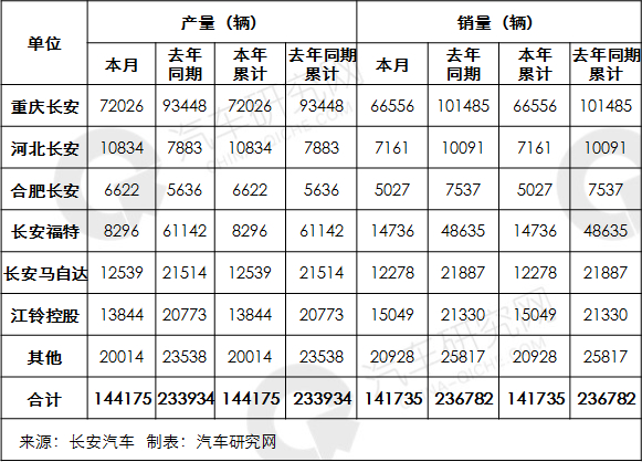 合肥长安1月汽车累计产量6622辆,同比增长17.49%,累计销量5027辆,同比下降33.30%。