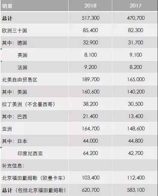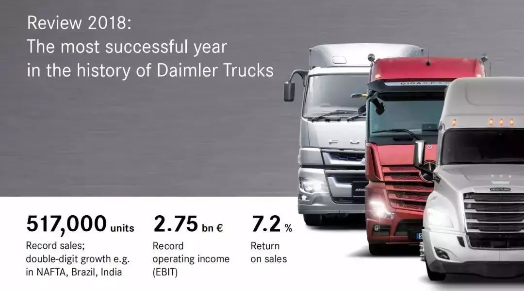 2018年是戴姆勒卡车史上最成功的一年,销量、营业收入和息税前利润均创历史新高。戴姆勒卡车部门2018年度报告显示,2018年销量增长率为10%,销量为517300辆,是戴姆勒目前为止的最高年度销量(2017年销量为470700辆)。戴姆勒卡车部门2018年的收入为383亿欧元(约合2932亿人民币),较2017年358亿欧元的收入,有显著提高。到2018年底,戴姆勒卡车实现了14亿欧元(约合107亿人民币)的盈利改善,并将在2019年全面生效。