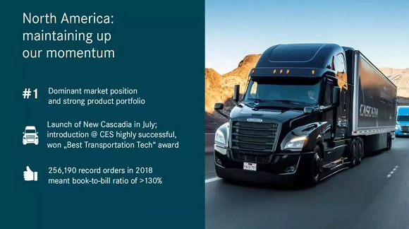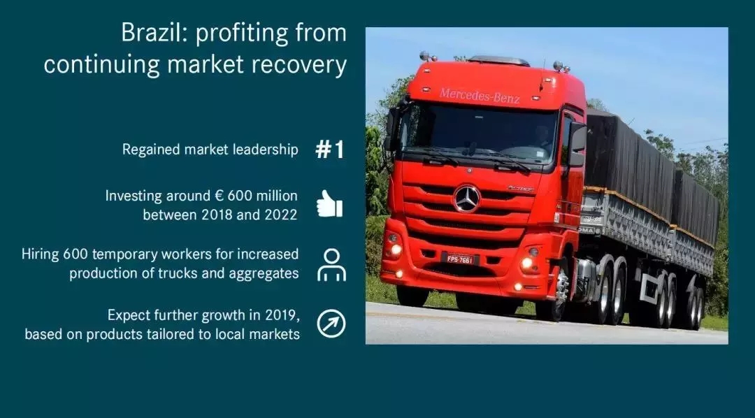 就目前来看,2019年,戴姆勒卡车在全球最重要的市场和地区都处于优势。在北美地区,卡车市场的领导者福莱纳即将推出能够量产部分自动驾驶的新型福莱纳Cascadia。在巴西,梅赛德斯-奔驰再次成为当地市场的领跑者,并且正在从复苏的市场中获益。在世界最大的卡车市场——中国,2018年,戴姆勒旗下的欧曼重卡销量超过10万辆。
