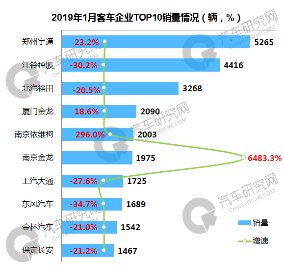 1月客车企业中,郑州宇通位居第一,增幅23.2%,是前三企业中唯一实现增长的,江铃控股紧随其后,销量跌30%,北汽的福田位居第三,同比下降20.5%,前十企业中,南京金龙本月销售1975辆,增幅远超60倍。