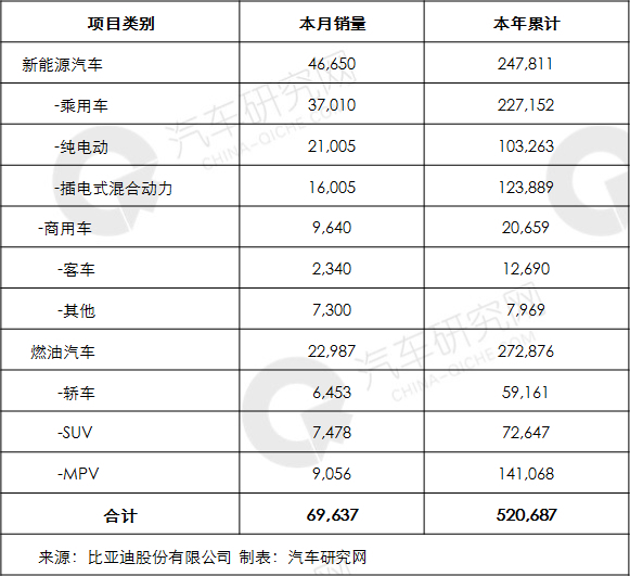 比亚迪发布2018年比亚迪汽车累计销量520687辆。新能源汽车1-12月销量247811辆,其中乘用车销量227152辆,商用车销量20659辆。燃油汽车1-12月销量272876辆,其中轿车销量59161辆,SUV销量72647辆,MPV销量141068辆。