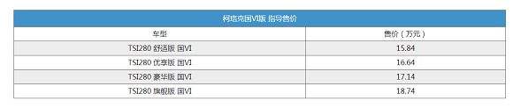 日前,我们从官方渠道获悉,上汽斯柯达柯珞克国Ⅵ车型正式上市,指导价格区间为15.84-18.74万元,包含舒适版、优享版、豪华版、旗舰版四款车型,配置方面与国Ⅴ版保持一致,但售价分别高出1500元。详见下表: