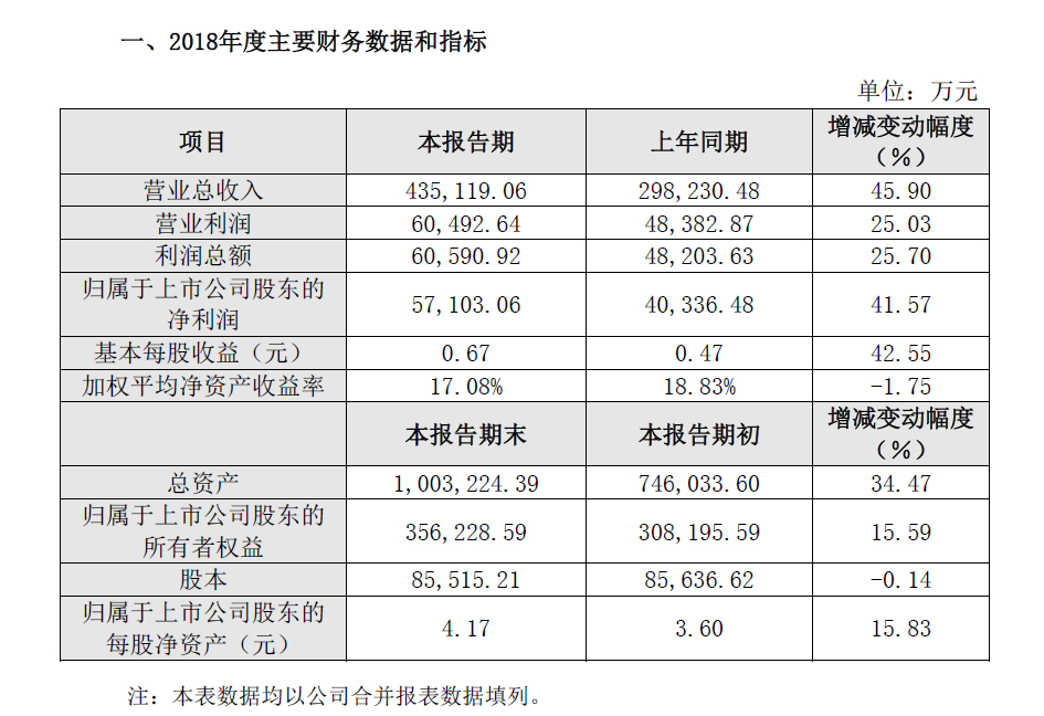 2月28日,亿纬锂能发布2018年业绩公告,公告显示,2018年度公司实现营业总收入435,119.06万元,较上年同期上升45.90%;营业利润60,492.64万元,较上年同期上升25.03%;利润总额60,590.92万元,较上年同期上升25.70%;归属于上市公司股东的净利润57,103.06万元,较上年同期上升41.57%。截止2018年12月31日,公司总资产1,003,224.39万元,较年初上升34.47%;归属于上市公司股东的所有者权益356,228.59万元,较年初上升15.59%。