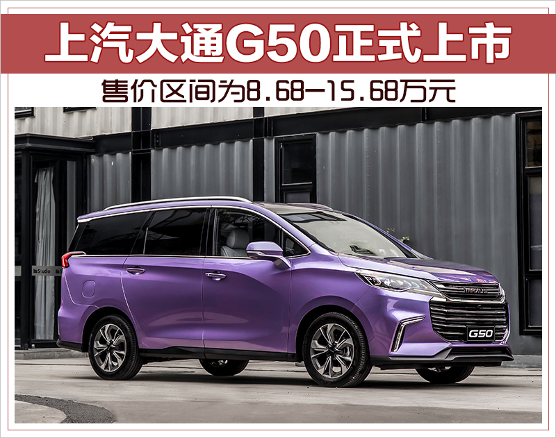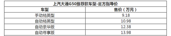 2018年广州车展期间,上汽大通全新MPV车型G50首发款率先上市,两款车型的售价分别为9.18万元、12.38万元。2月28日,从上汽大通官方获悉,G50正式上市,售价区间为8.68-15.68万元,用户可通过蜘蛛智选平台在这个价格区间内选择自己喜欢的配置(价格随配置不同而不同),另外,上汽大通也推出了4款推荐款车型,售价分别为9.18、10.98、12.38、13.98万元。