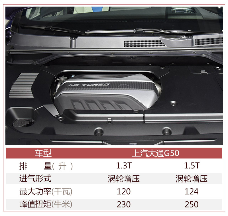 动力方面,上汽大通G50搭载1.3T和1.5T两款不同排量的涡轮增压发动机,前者的最大功率为120千瓦,峰值扭矩达到230牛米,百公里油耗仅为6.9升;后者则可以实现最大功率124千瓦、峰值扭矩250牛米的动力输出。传动系统部分,与发动机匹配的是6速手动与7速双离合手自一体变速箱。