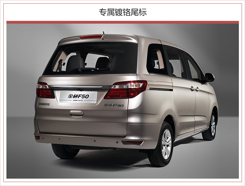 新车整体外观设计延续现款车型,前脸横幅式进气格栅与头灯相连,造型十分精致。下方保险杠进气口与两侧雾灯区域贯通,日间行车灯置于底部。侧面造型比较稳重,后门采用侧滑门的开启方式。金杯F50新车型尾部加入全新专属镀铬尾标,突显其与众不同。