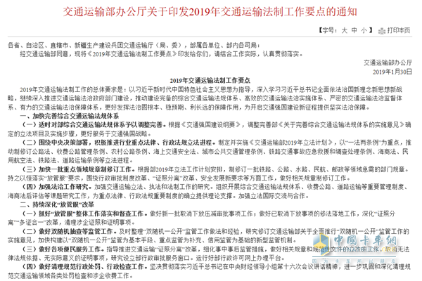 交通运输部办公厅印发《2019年交通运输法制工作要点》