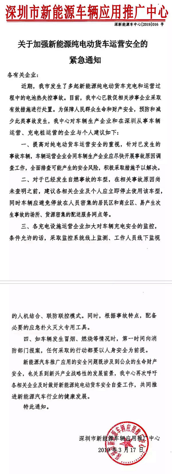3月17日,深圳市新能源车辆应用推广中心发布一则《关于加强新能源纯电动货车运营安全的紧急通知》(以下简称“通知”),“通知”表示,近期深圳市发生了多起新能源纯电动货车充电和运营过程中的电池热失控事故,为保障人民群众生命和财产安全,预防和减少此类事故发生,深圳市新能源车辆应用推广中心对车辆生产企业和在深圳从事车辆运营、充电桩运营的企业提出以下建议: