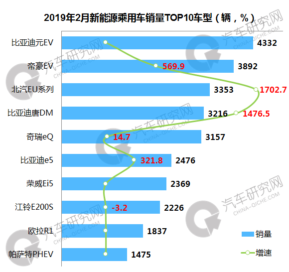 2月新能源乘用车车型中,比亚迪元EV单月销量达到4332辆,排名第一,帝豪EV增长5.7倍居第二位,销量达3892辆。从销量前十榜单中,比亚迪占3席;北汽EU系列和比亚迪唐DM本月表现尤为突出,增幅超1400%,帕萨特插混车型挤进本月前十。
