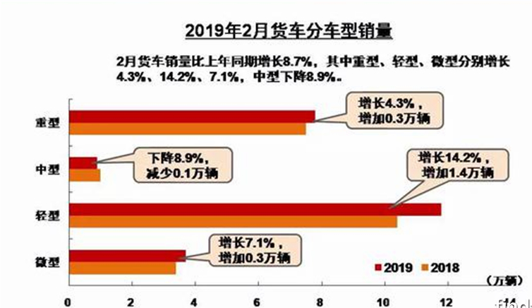 通过分析2月份的数据,卡车整体销量同比增长8.7%,轻型卡车增幅最大,达14.2%。但一月、二月并非传统的行业旺季,也许只有待“金三银四”之后,2019年卡车行业的走向才能方现端倪。