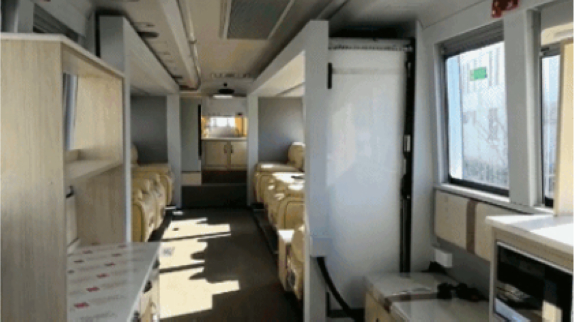 此批车辆中最具特色的当属成分采血车,因成分采血比采全血的时间更长,对环境、设备的稳定性等要求较高,为保证献血人员的舒适性,金龙成分采血车采用美国进口左右滑移仓,在国外,它往往被用在军工指挥车上面,欧美顶级房车上也可见其身影。滑移舱的安装位置颇费匠心,它被设计在等候区域——传统12米客车宽度一般为2.55米,但滑移舱打开后,车内宽双滑移约达4米,再配以2.25米的车内高度,采血车的舒适空间正受益于此。此外,它配备国内领先的釆血泵以及血小板震动箱,完美实现成分釆血全流程。为保障献血及釆血人员的舒适感,成分采血车还配备了全自动车身平衡装置。