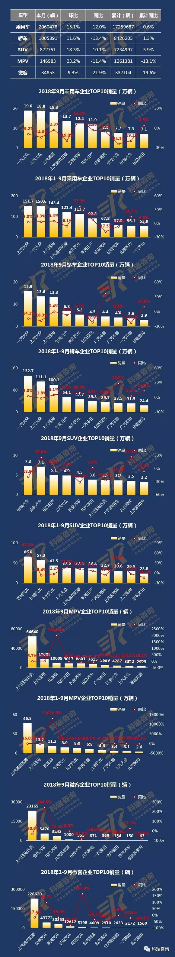 •企业销量看,9月,各市场排名首位的企业分别为:乘用车(一汽大众19.0万辆)、轿车(一汽大众15.9万辆)、SUV(长城汽车7.3万辆)、MPV(上汽通用五菱64640辆)、微客(上汽通用五菱23165辆)。1-9月,各市场排名首位的企业分别为:乘用车(上汽大众151.7万辆)、轿车(一汽大众132.7万辆)、SUV(吉利汽车66.0万辆)、MPV(上汽通用五菱46.8万辆)、微客(上汽通用五菱228620辆)。