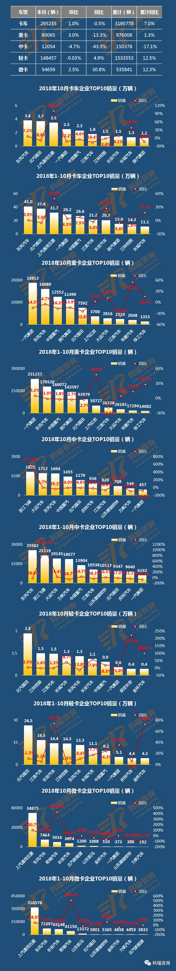 •企业销量看,10月,各市场排名首位的企业分别为:卡车(东风汽车3.8万辆)、重卡(一汽集团18813辆)、中卡(浙江飞碟1821辆)、轻卡(北汽福田2.8万辆)、微卡(上汽通用五菱34875辆)。1-10月,各市场排名首位的企业分别为:卡车(东风汽车41.0万辆)、重卡(一汽集团23.1万辆)、中卡(东风汽车25502辆)、轻卡(北汽福田26.5万辆)、微卡(上汽通用五菱31.6万辆)。