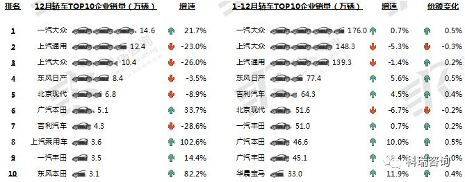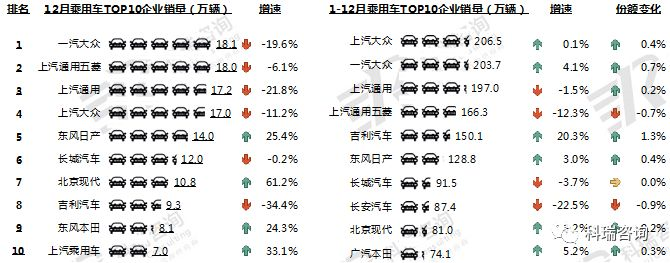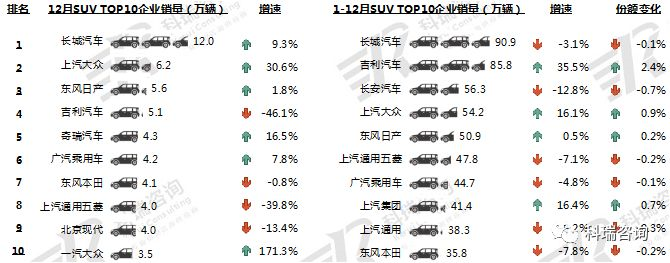 12月,TOP10 SUV企业销量六升四降。长城汽车本月销售达到12万辆,位居榜首,上汽大众和一汽大众同比均超30%。1-12月,TOP10