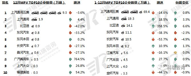 MPV企业销量五升五降。上汽通用五菱依旧位居榜首,本月销售9.3万辆,实现大幅增长的企业是广汽乘用车与福建奔驰。1-12月,TOP10