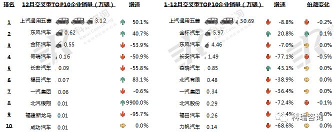 12月,TOP10交叉型企业销量四升五降一平。上汽通用五菱本月销售3.12万辆,位居榜首,上汽通用五菱、东风汽车、福田汽车和北汽银翔同比增速均超40%。1-12月,TOP10交叉型企业销量二升八降。上汽通用五菱累计销售30.69万辆,遥遥领先,实现增长的两家企业是金杯汽车与奇瑞汽车,增速均达20%以上。