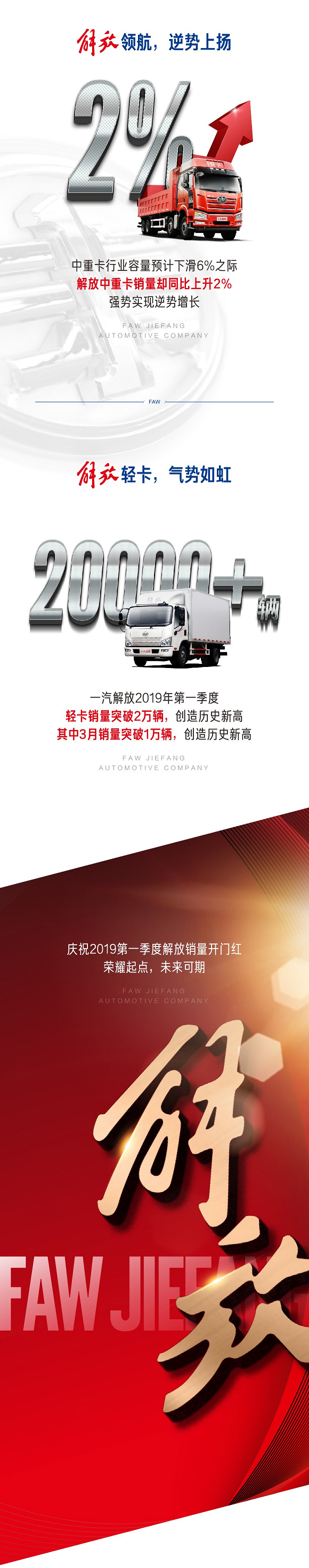 解放销量,一路领航。2016年,一汽解放重回重卡行业第一;2017年、2018年,在复杂多变的市场形势下,一汽解放更是长期保持中重卡行业第一;2019年,解放拿下首季开门红!成绩的背后,是一汽解放体系能力提升的体现。近年来,一汽解放始终以客户为中心,强化客户体验;以产品为主线,推进产品升级;强化渠道赋能,加速能力提升,践行高质量营销。