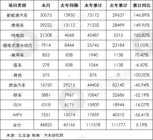 比亚迪3月份销量快报:新能源车销量同比降59.25% 燃油车升9.51%