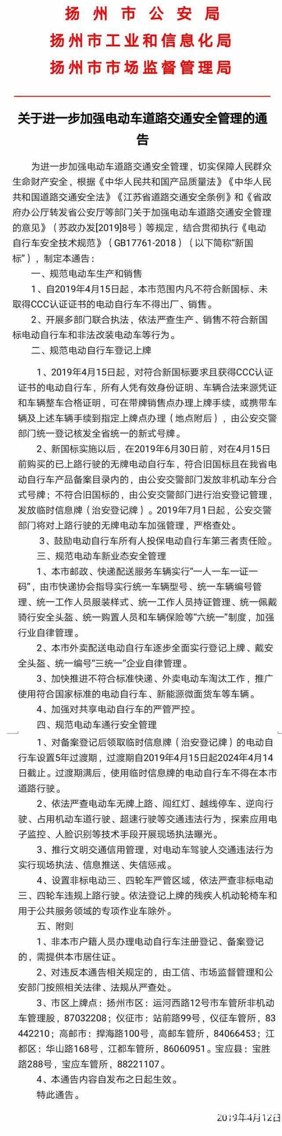 扬州市公安局、扬州市工业和信息化局、扬州市市场监督管理局4月12日联合发布了《关于进一步加强电动车道路交通安全管理的通告》,通告指出,将加快推进不符合标准快递的电动车淘汰工作,推广使用符合国家标准的新能源微面货车等车辆。