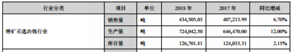 2018年锂矿销售收入为22亿元,同比增加24.2%;锂化合物及其衍生品销售收入为40.4亿元,同比增加9.3%。同时,公司2018年锂矿行业销售量达产量72.4吨,同比增长12%,43.45万吨,同比增长6.7%。