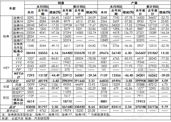 5月9日,长城汽车发布了2019年4月产销快报,根据数据显示,4月,长城汽车共销售新车83838辆,同比增长2.5%。其中,出口6459辆,同比增长35.64%。哈弗、WEY、长城皮卡和欧拉分别以58444辆、7293辆、13487辆和4614辆的不俗的成绩,WEY品牌同比下滑明显,达到44.49%;1-4月累计销售367680辆,同比增长8.65%,完成2019年的销量目标120万的31%。