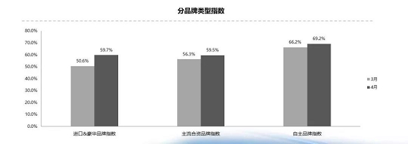 2019年4月进口&豪华品牌指数、合资品牌指数、自主品牌指数较上月上升;其中豪华品牌库存指数上升幅度较大,上升9.1个百分点,主要受“西安奔驰维权事件”影响所致。