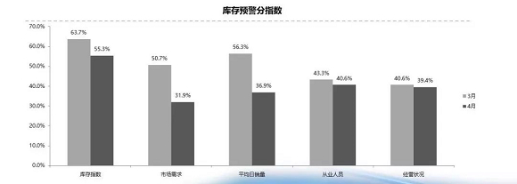 从分指数情况看:调查显示,库存指数、市场需求指数、平均日销量指数、从业人员指数、经营状况指数环比下降。