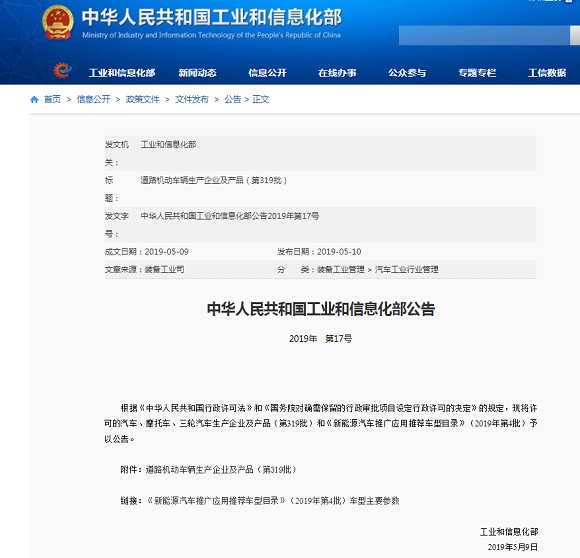 2019年5月10日,工业和信息化部在官方网站发布了第319批《道路机动车辆生产企业及产品公告》。申报本批《公告》的汽车、摩托车、低速汽车生产企业共计692户,新产品共计3773个。