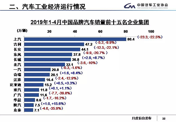 1-4月,中国品牌汽车销量排名前十家企业依次是:上汽、吉利、长安、东风长城汽、奇瑞、江淮和比亚迪。与上年同期相比,长城、奇瑞和比亚迪销量有所增长其他企业呈一定下降,其中上汽、长安和东风降幅更为明显。1-4月,上述十家企业共销售351.06万辆,占中国品牌汽车销售总量的82.91%。