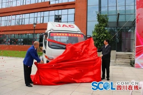 5月13日9时许,在遂宁市安居区,随着一辆披挂红绸的全新白色新能源轻卡汽车被揭开面纱,第一辆“遂宁安居造”新能源汽车正式下线。