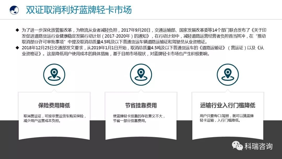 为了进一步深化放管服改革,为物流从业者减轻负担,2017年9月20日,交通运输部、国家发展改革委等14个部门联合发布了《关于印发促进道路货运行业健康稳定发展行动计划(2017-2020年)的通知》,在行动计划中,减轻道路运营经营者负担首当其冲,在“推动取消部分许可审批事项”中提及取消总质量4.5吨及以下普通货运车辆道路运输证和驾驶员从业资格证。
