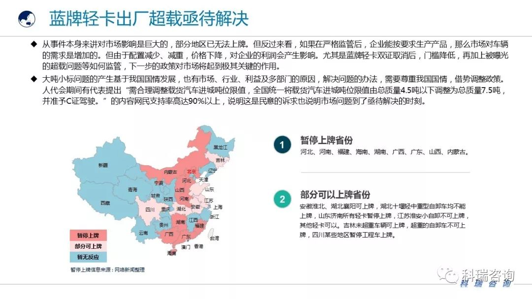 从事件本身来讲对市场影响是巨大的,部分地区已无法上牌。但反过来看,如果在严格监管后,企业能按要求生产产品,那么市场对车辆的需求是增加的。但由于配置减少、减重,价格下降,对企业的利润会产生影响。尤其是蓝牌轻卡双证取消后,门槛降低,再加上被曝光的超载问题等如何监管,下一步的政策对市场将起到极其关键的作用。