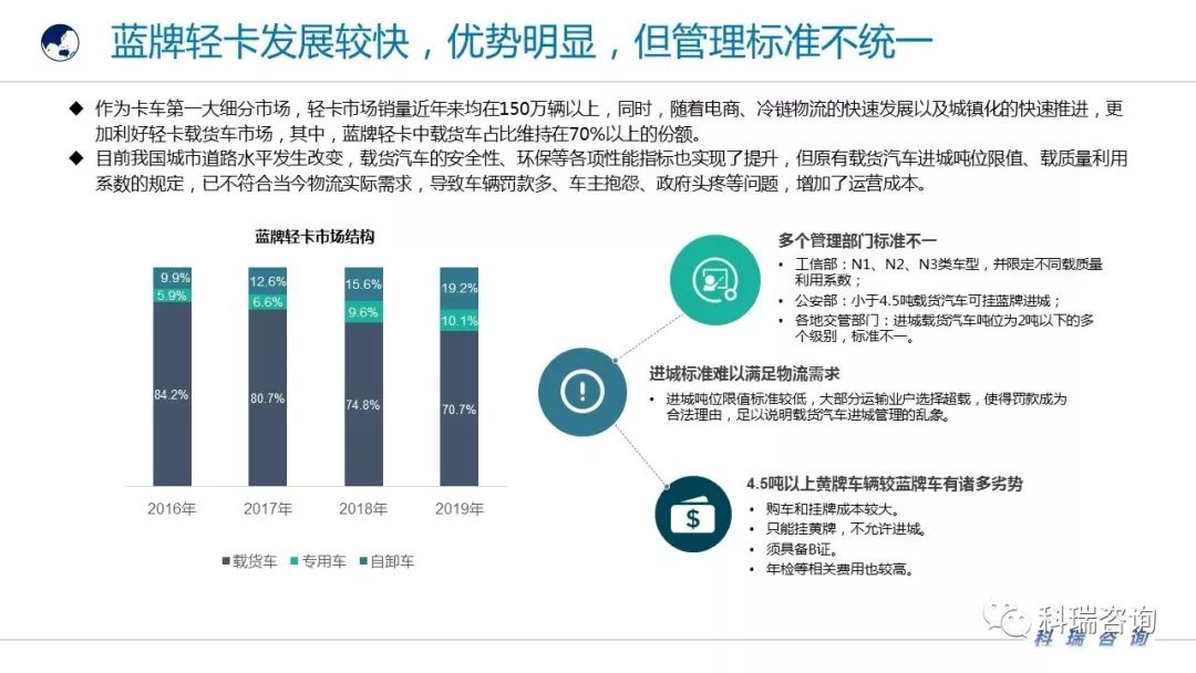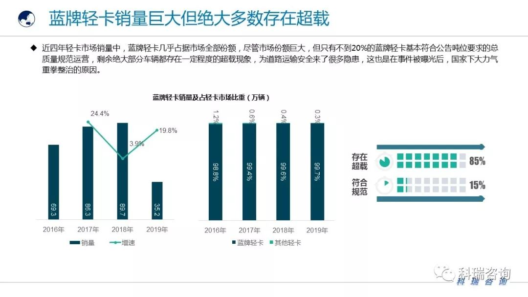 近四年轻卡市场销量中,蓝牌轻卡几乎占据市场全部份额,尽管市场份额巨大,但只有不到20%的蓝牌轻卡基本符合公告吨位要求的总质量规范运营,剩余绝大部分车辆都存在一定程度的超载现象,为道路运输安全来了很多隐患,这也是在事件被曝光后,国家下大力气重拳整治的原因。