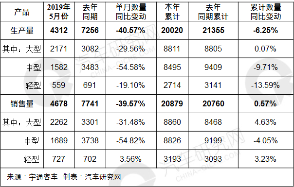 6月4日,宇通客车发布2019年5月产销数据快报,2019年5月份,生产量4312辆,同比下滑40.57%;销售量4678辆,同比下滑39.57%。1-5月,累计生产量20020辆,同比下滑6.25%,累计销售量20879辆,同比增长0.57%。